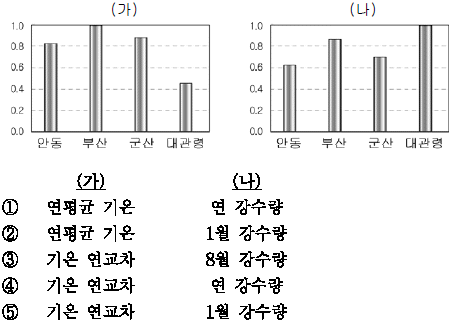 그래프는 각 지역의 기후 평년값을 최고치에 대한 상대 비율로 나타낸 것이다. (가)와 (나)에 해당하는 기후 요소를 알맞게 연결한 것은?(단, 네 지역의 기후 평년값 중 최고치를 1로 표현)
