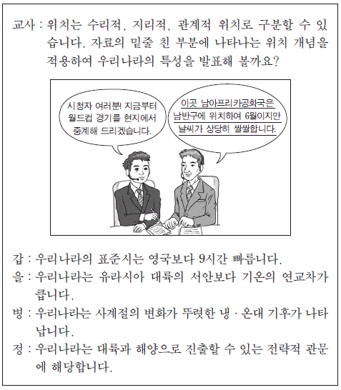 다음은 우리나라의 위치에 관한 수업 장면이다. 교사의 질문에 옳게 대답한 학생을 고른 것은?