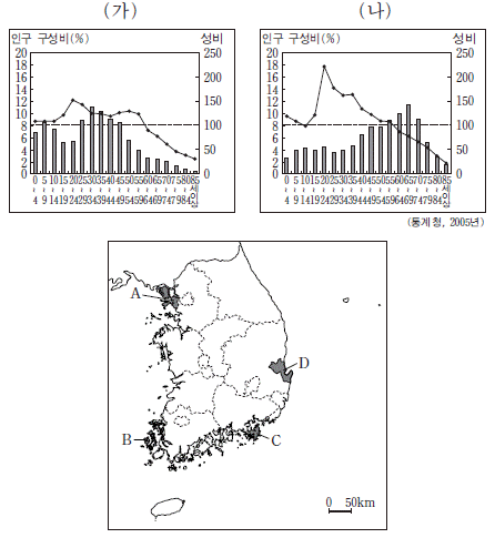 (가), (나) 그래프는 어느 해안 지역의 연령별 인구 구성비와 성비를 나타낸 것이다. 이에 해당하는 지역을 지도에서 고른 것은? (순서대로 가, 나) [3점]