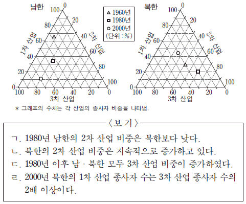 그래프는 남한과 북한의 산업 구조 변화를 나타낸 것이다. 이에 대한 옳은 분석을 <보기>에서 고른 것은?