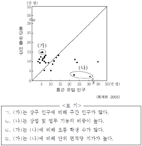 그래프는 어느 대도시의 구(區)별 통근 유출 인구와 통근 유입 인구를 나타낸 것이다. (가), (나) 지역에 대한 옳은 설명을 <보기>에서 고른 것은? [3점]