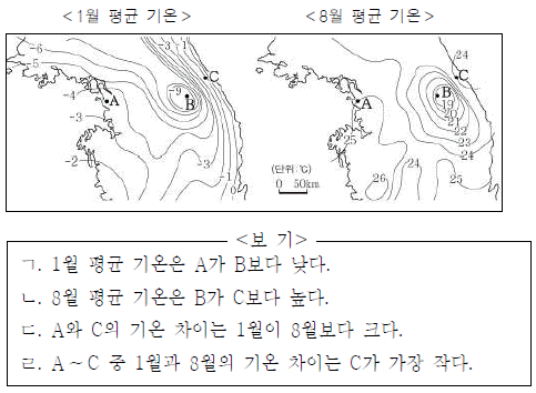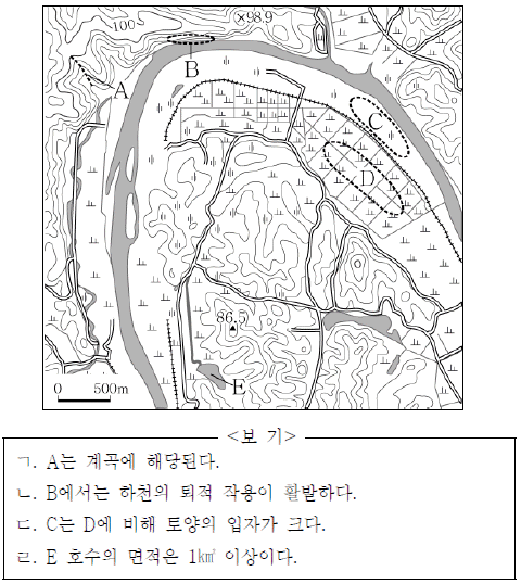 지도의 A~E에 대한 옳은 설명을 <보기>에서 고른 것은? [3점]