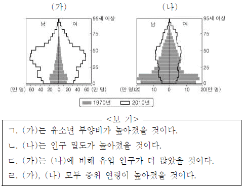 그래프는 (가), (나) 지역의 인구 구조 변화를 나타낸 것이다. 이에 대한 옳은 추론을 <보기>에서 고른 것은? [3점]