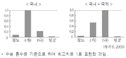 그래프는 교통수단별 화물 수송량을 최고치에 대한 상대 값으로 나타낸 것이다. (나)와 비교한 (가)의 특징으로 옳은 것은?