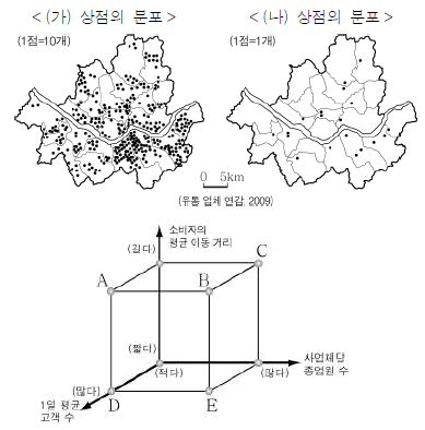자료의 (가) 상점과 비교한 (나) 상점의 상대적 특징을 그림에서 고른 것은? (단, (가)와 (나)는 동일 업종임.) [3점]
