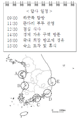 다음은 어느 지역에 관한 답사 일정의 일부이다. 이에 해당하는 지역을 지도의 A ~ E에서 고른 것은?