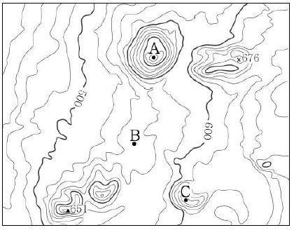 지도의 A ~ C를 해발 고도가 높은 지점에서 낮은 지점 순으로 바르게 배열한 것은?