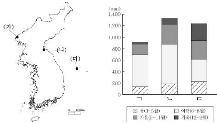 지도에 표시된 (가)~(다) 지역의 계절별 강수량을 그래프에서 고른 것은? (순서대로 가, 나, 다) [3점]