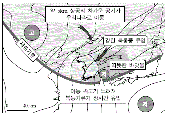한반도 주변의 기상 상태가 그림과 같이 나타날 때, 발효될 수 있는 기상 특보 내용으로 가장 적절한 것은?
