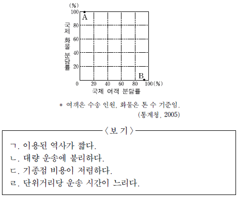 그래프는 우리나라 A, B 운송 수단의 국제 운송량 비중을 나타낸 것이다. A에 대한 B의 상대적 특징으로 옳은 설명을 <보기>에서 고른 것은?