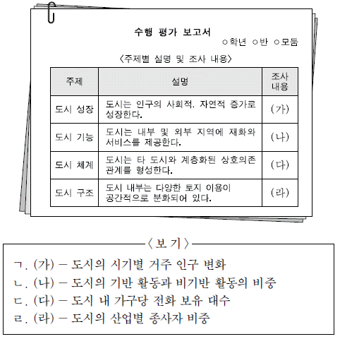 다음은‘도시’단원과 관련된 수행 평가 보고서의 일부이다. (가)~(라)에 들어갈 옳은 내용을 <보기>에서 고른 것은?[3점]