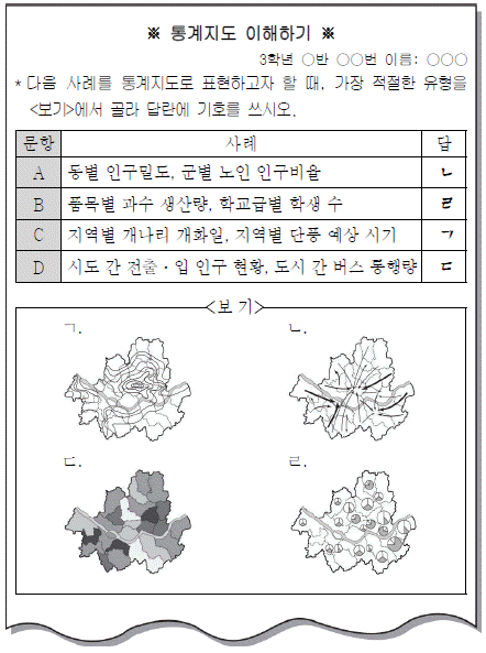 다음은 통계지도에 대한 학습지의 일부이다. 학생의 답이 옳게 표기된 문항을 고른 것은?