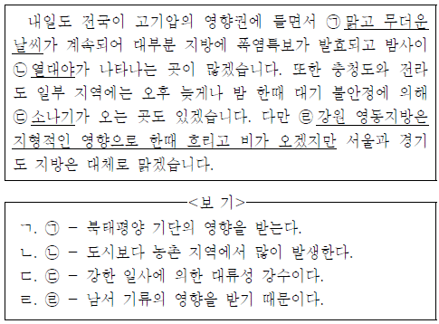 다음은 일기 예보의 일부이다. 밑줄 친 (ㄱ)∼(ㄹ)에 대한 설명으로 적절한 것을 <보기>에서 고른 것은? [3점]