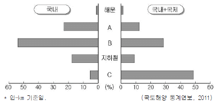 그래프는 여객 수송량 비중을 나타낸 것이다. A~C 교통 수단에 대한 설명으로 옳은 것은? [3점]