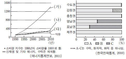 그래프는 우리나라의 1차 에너지원별 소비량 지수와 지역에 따른 발전 양식별 전력 생산량 비중을 나타낸 것이다. 이에 대한 설명으로 옳은 것은?[3점]