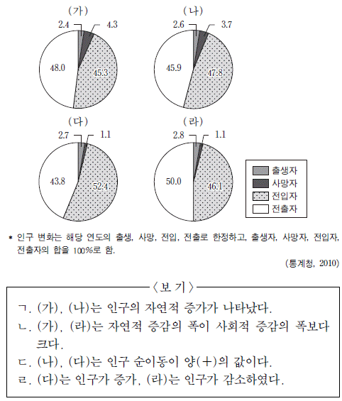 그래프는 (가)~(라) 지역의 인구 변화에 관한 것이다. 이에 대한 옳은 설명을 <보기>에서 고른 것은?[3점]