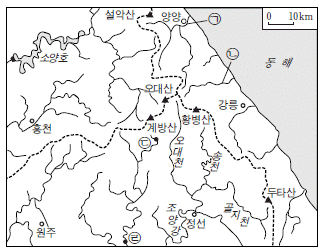 지도는 강원도 지역의 하천 수계와 주요 산지를 나타낸 것이다. 이에 대한 설명으로 옳지 않은 것은?[3점]