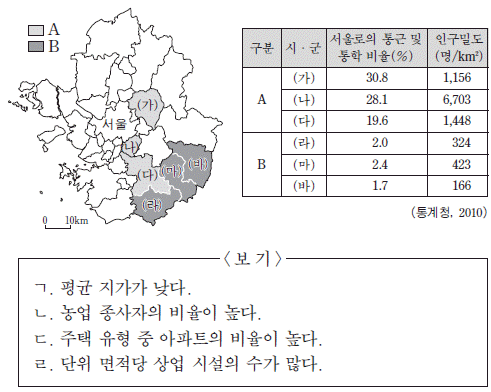 다음 자료에서 A 지역과 비교한 B 지역의 상대적 특성을 <보기> 에서 고른 것은?