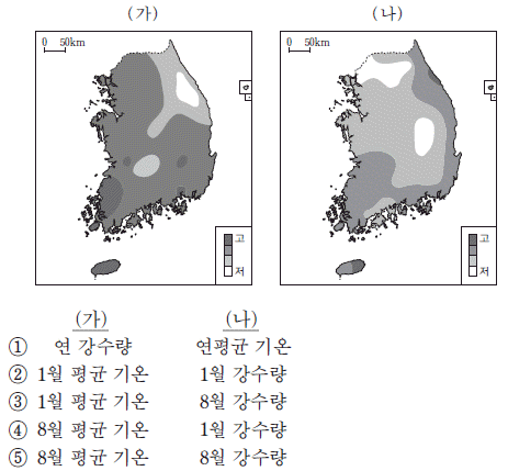 지도는 어떤 기후 지표의 분포를 나타낸 것이다. (가), (나)의 기후 지표로 옳은 것은?[3점]