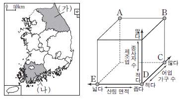 지도의 (가) 지역과 비교한 (나) 지역의 상대적 특성을 그래프의 A~E에서 고른 것은?