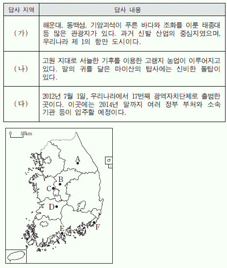 다음은 학생이 답사 후 작성한 지리 발표 자료의 일부이다. (가)~(다)에 해당하는 지역을 지도에서 고른 것은? (순서대로 가, 나, 다) [3점]
