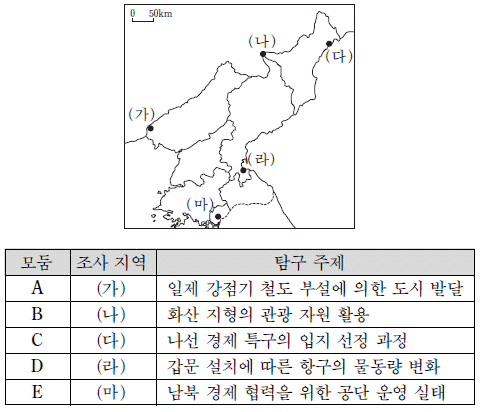 다음은 (가)~(마) 지역의 특성에 대한 모둠별 탐구 주제를 정리한 것이다. 각 조사 지역에 대한 탐구 주제의 선정이 적절하지 않은 모둠을 고른 것은?