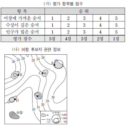 ○○군은 새로운 어항 건설 후보지에 대한 평가를 실시하였다. (가), (나)를 토대로 A~E 중 최적 입지를 고른 것은? (단, 평가점수의 합이 최고인 지점이 최적 입지임.)