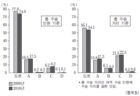 그래프는 교통수단별 국내 여객 수송 분담률 변화를 나타낸 것이다. A~D 교통수단에 대한 설명으로 옳은 것은?[3점]