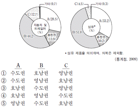 그래프는 주요 공업의 지역별 출하액 비중을 나타낸 것이다. A~C 지역으로 옳은 것은?