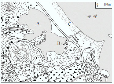 지도의 A~C 지형에 대한 설명으로 옳은 것은?