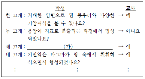 [과목 구분 없음] 다음은 산지 지형에 대해 학생과 교사가 스무고개를 하고 있는 장면이다. (가)에 들어갈 내용으로 옳은 것은? [3점]