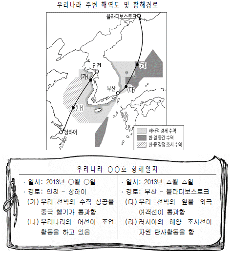 (가)~(라) 지점에서 이루어진 행위로 적절한 것을 고른 것은?(단, 모든 행위는 국가 상호 간 사전 허가가 없었음.) [3점]