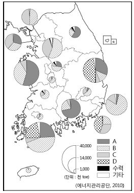 지도는 지역별 1차 에너지원별 소비구조를 나타낸 것이다. A~D에 대한 설명으로 옳은 것은? [3점]