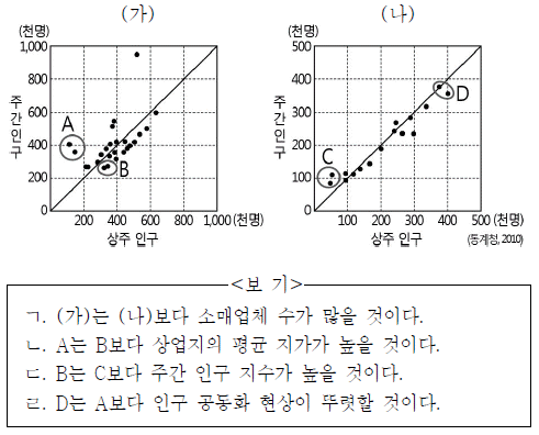 그래프는 (가), (나) 대도시의 구(區)별 주간 인구와 상주 인구를 나타낸 것이다. 이에 대한 추론으로 옳은 것을 <보기>에서 고른 것은? [3점]