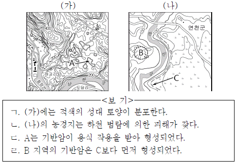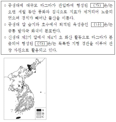 (가)~(다)에 해당하는 암석이 분포하는 지역을 지도의 A∼C에서 고른 것은? (순서대로 가, 나, 다)