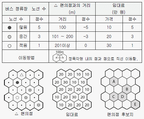 다음 조건을 토대로 새로운 편의점의 입지를 선정하려고 할때 가장 적합한 것은? [3점]
