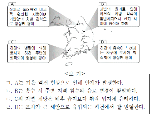 지도의 A~D 지형에 대한 옳은 설명을 <보기>에서 고른 것은?