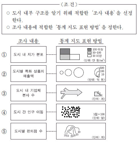 다음 <조건>을 고려하여 선정한 조사 내용과 통계 지도 표현 방법으로 가장 적절한 것은?