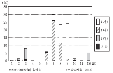 그래프는 자연재해의 월별·원인별 발생 횟수 비율을 나타낸 것이다. 이에 대한 설명으로 옳지 않은 것은? (단, (가)~(다)는 대설, 태풍, 호우 중 하나임.) [3점]
