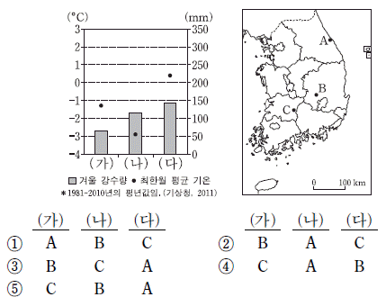 그래프의 (가)~(다)에 해당하는 지역을 지도의 A~C에서 고른 것은? [3점]