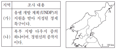 표는 북부 지방에 대한 조사 내용을 정리한 것이다. (가), (나)에 해당하는 지역을 지도에서 고른 것은? (순서대로 가, 나) [3점]