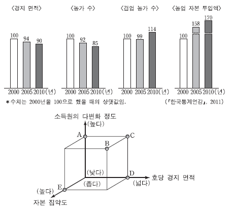 그래프는 우리나라 농업의 변화를 나타낸 것이다. 2000년에 대한 2010년의 상대적 특성을 그림의 A~E에서 고른 것은? [3점]