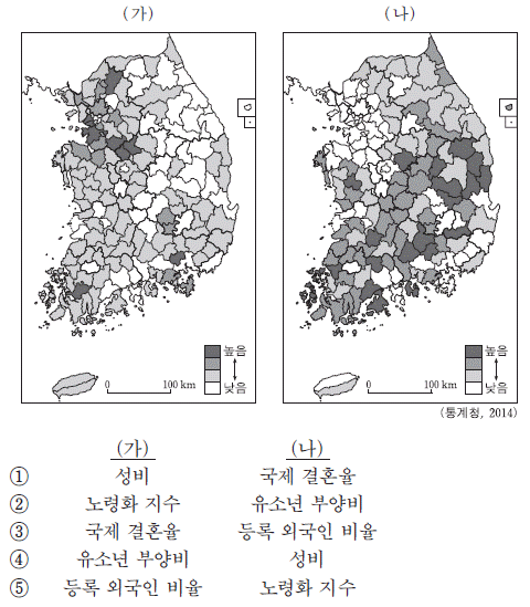 지도는 어떤 인구 관련 지표의 지역별 분포를 나타낸 것이다. (가), (나)에 해당하는 지표로 옳은 것은? [3점]