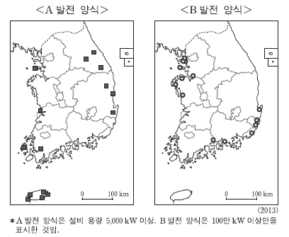 지도는 A, B 발전 양식의 분포를 나타낸 것이다. A, B 발전 양식에 대한 설명으로 옳은 것은?