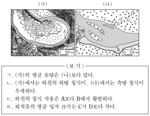 (가), (나)는 동일한 하천의 두 구간을 나타낸 것이다. 이에 대한 옳은 설명을 <보기>에서 고른 것은? [3점]