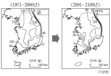 지도는 지역별 겨울의 기간 변화를 예측한 것이다. 이와 같은 변화가 현실화될 때 우리나라에서 나타날 현상에 대한 추론으로 옳은 것은?
