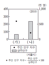 그래프는 서울시 두 구(區)의 주간 인구 지수와 상주인구를 나타낸 것이다. (가) 구와 비교한 (나) 구의 상대적 특성으로 가장 적절한 것은?