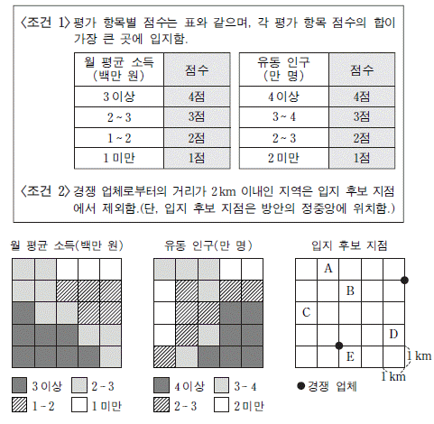 다음 <조건>을 고려할 때 ○○ 업체의 입지 지점으로 가장 적절한 곳을 입지 후보 지점 A~E 중에서 고른 것은?