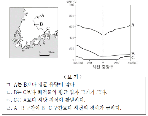 다음 자료는 A∼C 지점에서 하천 중앙부를 기준으로 지형 단면을 나타낸 것이다. 이에 대한 옳은 설명을 <보기>에서 고른 것은?