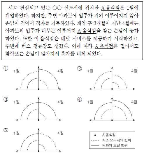 다음 글의 밑줄 친 A음식점의 시기별 최소 요구치의 범위와 재화의 도달 범위를 가장 적절하게 나타낸 것은? [3점]
